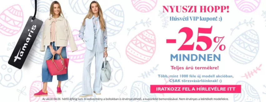 Ne hagyd ki Tamaris ajánlatait, és maradj naprakész a legjobb árakkal és akciókkal minden üzletben 2026 április folyamán. Kezdj el felfedezni minden Tamaris üzletet, és ismerd meg az exkluzív promóciókat, amelyeket Neked készítettünk!